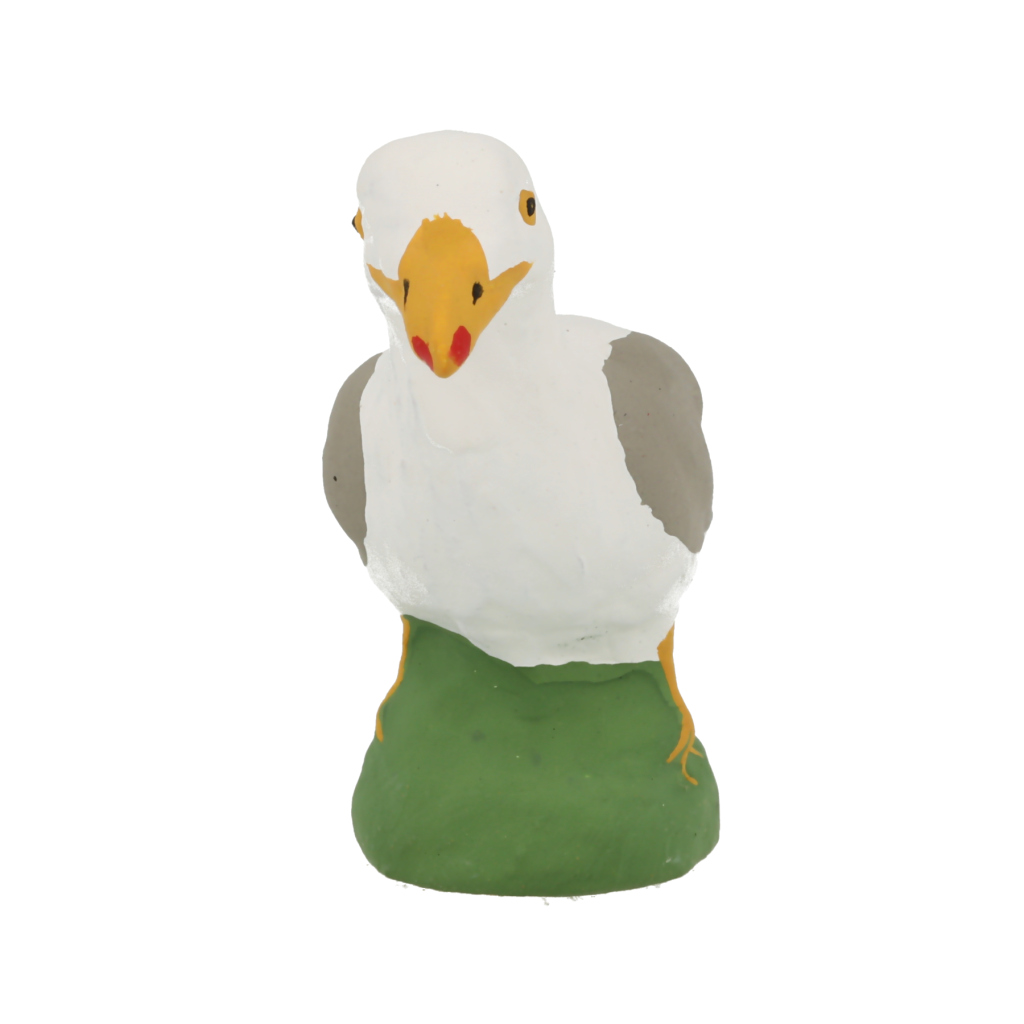 Ce santon de Provence met en scène le gabian, emblématique goéland des rivages méditerranéens. Son plumage d’un gris perlé, son poitrail blanc éclatant et son regard perçant évoquent les horizons marins de Marseille, entre Vallon des Auffes, îles du Frioul et Vieux-Port.