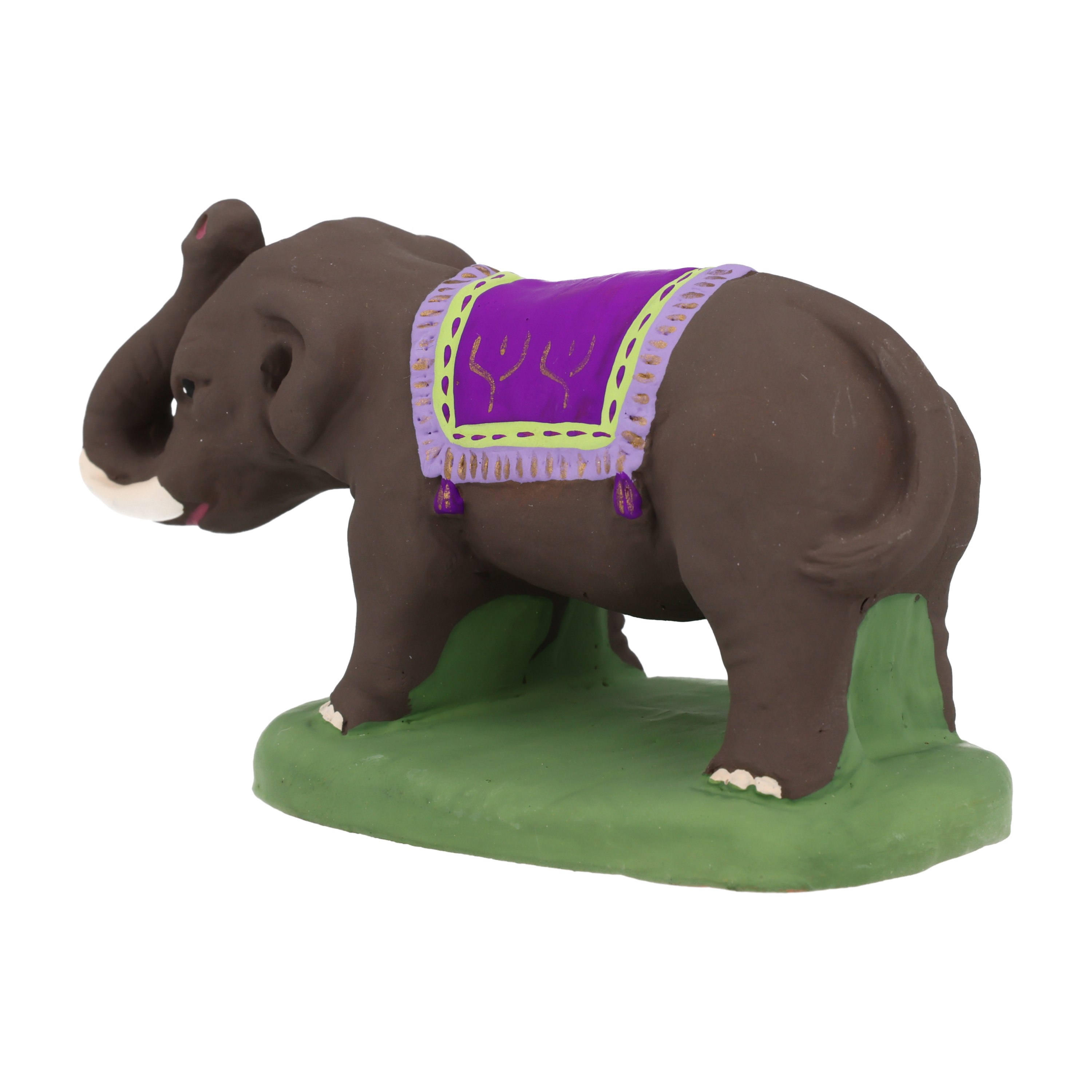 Ce santon de Provence met en scène un éléphant paré d’une élégante couverture violette finement décorée, compagnon des Rois Mages dans leur voyage vers la crèche de Bethléem.