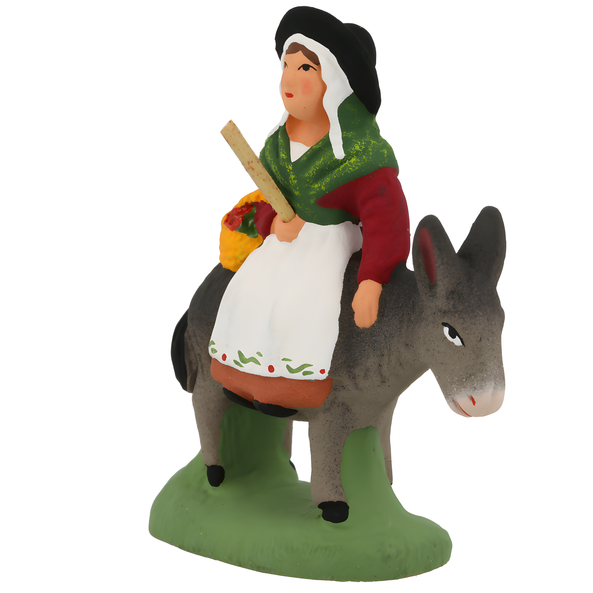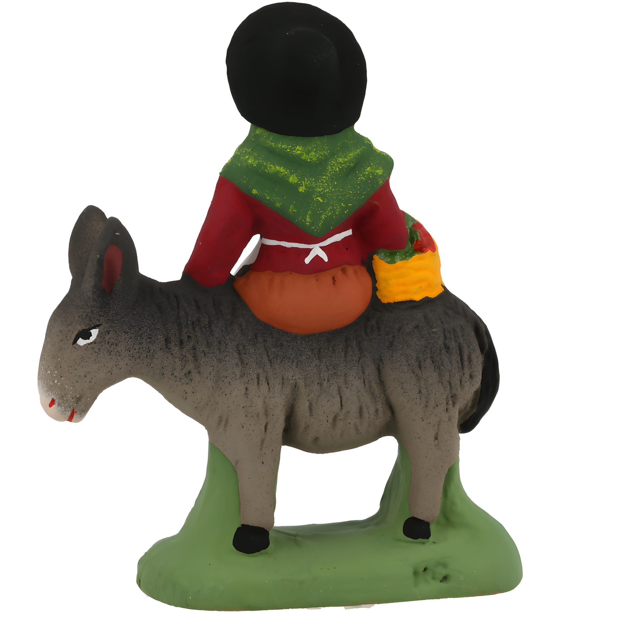 Bourgeoise, connue sous le nom de Margarido, épouse de M. Jourdan, dans la Pastorale Maurel. Elle est fièrement installée sur son âne, le chemin étant encore long jusqu'à l'étable ! Sur sa coiffe en dentelle blanche, elle porte un chapeau noir à large bord, afin de mieux se protéger du soleil. Elle tient un panier garni de victuailles à côté d'elle.