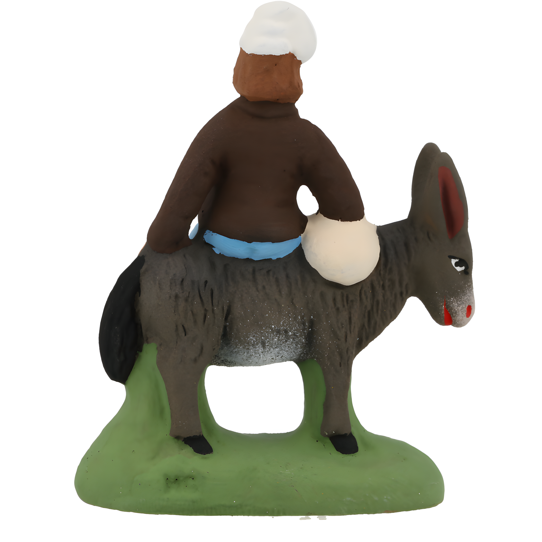 Meunier descendant au village sur son âne, un sac de farine posédevant lui. Il est coiffé du traditionnel bonnet en coton blanc et porte un pantalon en grosse toile jaune.