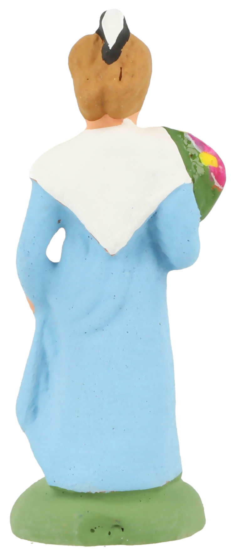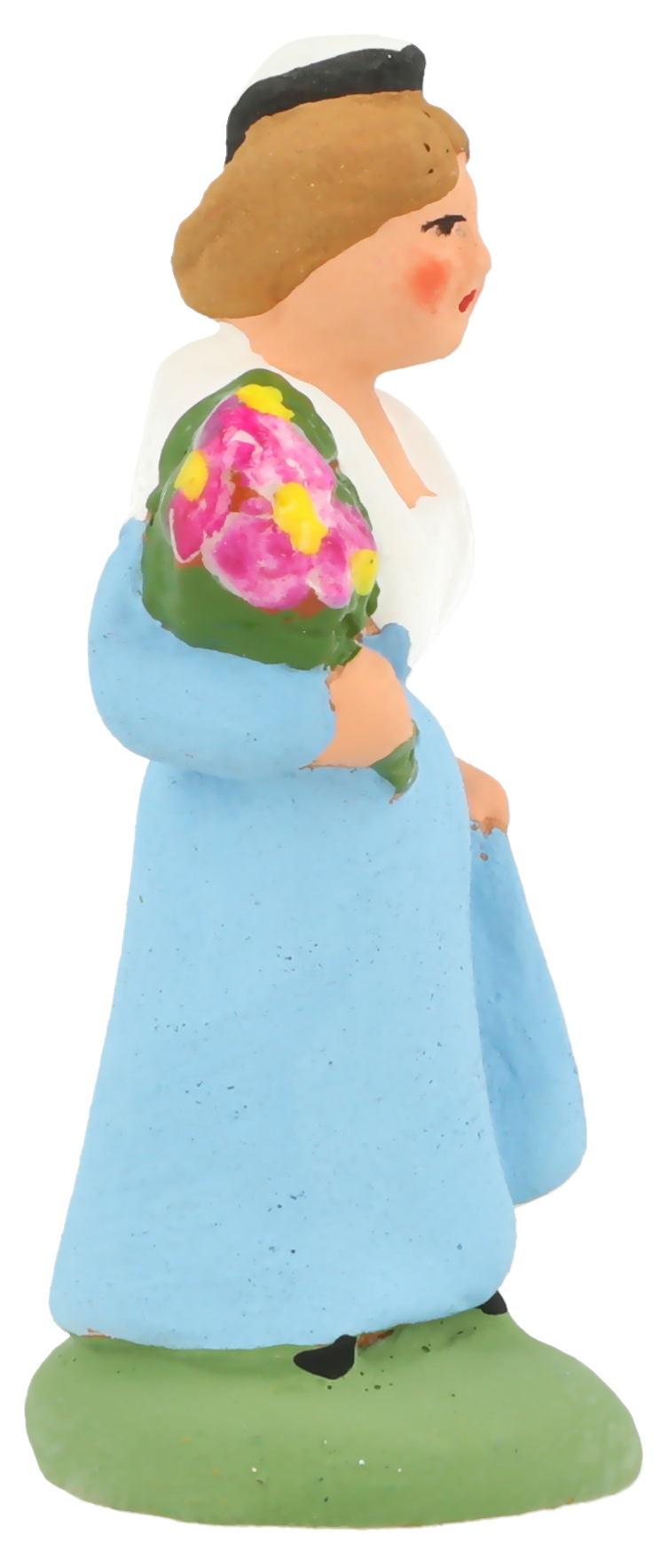 Egalement appelée “Arlatenco” en pays d’Arles. Jeune femme issue de la paysannerie aisée d’Arles. Elle tient à la main un bouquet de fleurs qu’elle s’apprête à offrir à l’enfant Jésus. Elle est parfois assimilée au personnage de Mireille, l’héroïne de l’écrivain Frédéric Mistral. Elle porte le costume traditionnel de la région d’Arles au xixe siècle, châle blanc brodé et large jupon. On la reconnaît également à sa coiffure particulière : les cheveux sont séparés par une raie médiane, formant un bandeau. Puis, la chevelure est ramenée en arrière en chignon recouvert d’une mousseline blanche et entouré d’un ruban brodé fixé par des épingles en or. C’est cet élément qui fait la richesse du costume. Arles est une ville d’art très ancienne et un centre important des traditions de la Provence. (existe avec robe bleue, violette, rouge ou jaune)