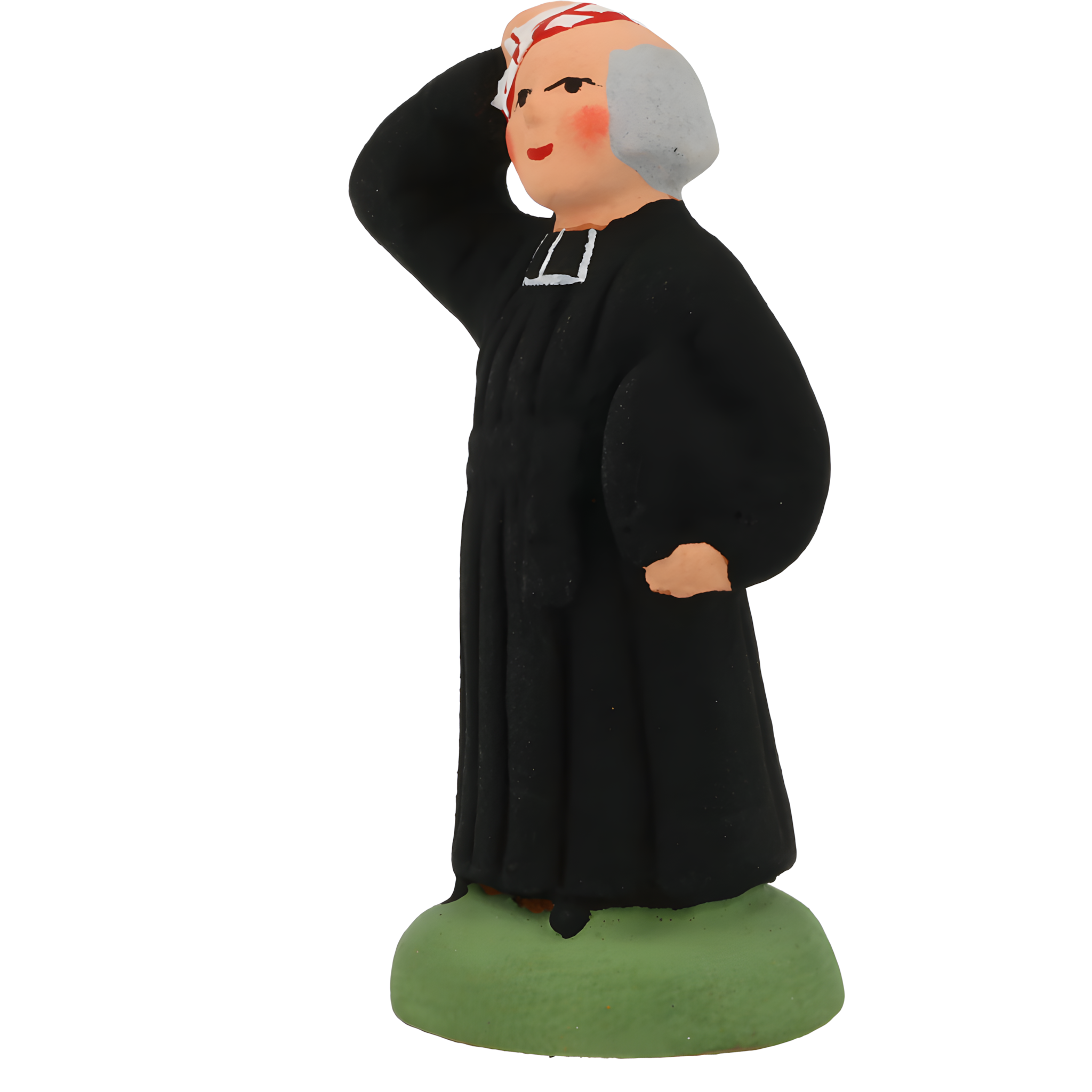 Prêtre placé à la tête d'une paroisse. Pour un puriste, un prêtre au sein de la crèche peut paraître surprenant, puisqu'en effet il est le représentant du Christ et que celui-ci vient de naître ! Mais les Provençaux tiennent à ce qu'il soit présent, car il compte parmi les personnalités du village. Marcel Carbonel le représente dans deux attitudes différentes : Le curé au mouchoir, tête nue, s'essuyant le front avec un grand mouchoir (lou moucadou) à carreaux rouge et blanc, vêtu d'une soutane noire. Le curé au parapluie, portant le traditionnel parapluie rouge (signe de respectabilité en Provence), un grand chapeau noir et tenant son bréviaire à tranche dorée à la main.