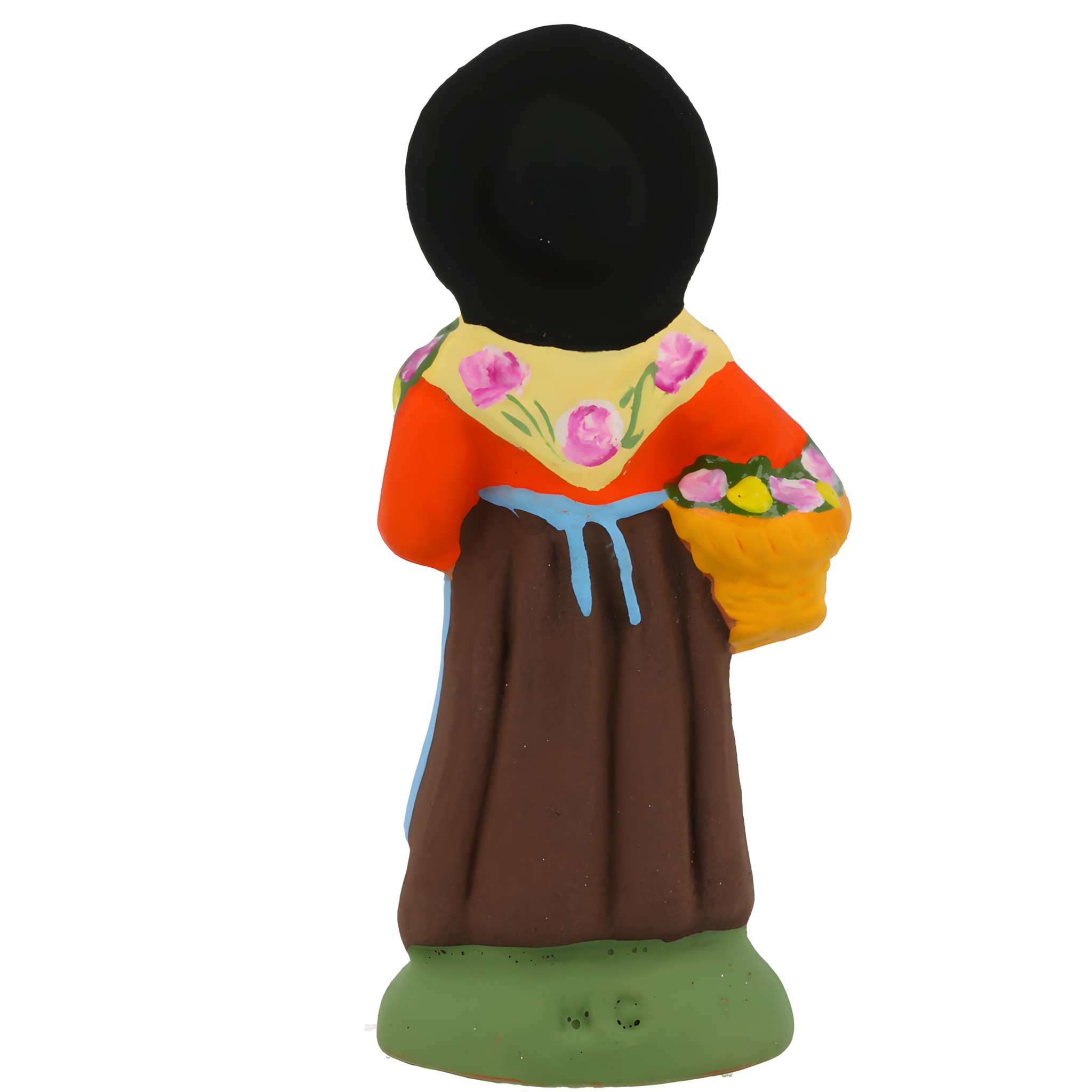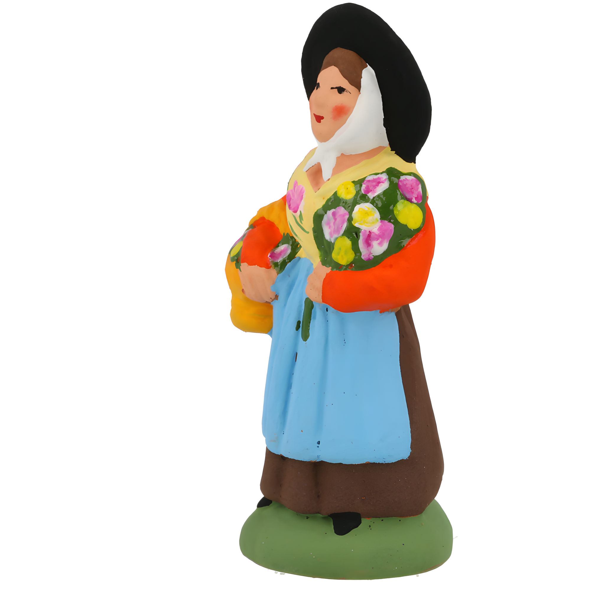 Marchande de fleurs ambulante. Ainsi que chacun des personnages de la crèche, elle apporte en offrande à l’enfant Jésus le fruit de son travail : un petit bouquet rond dans une main, un panier plein de fleurs à son bras. Une paire de ciseaux est rattachée à sa taille par un ruban noir. Sur sa coiffe en coton blanc, elle porte un chapeau noir à large bord pour mieux se protéger du soleil.