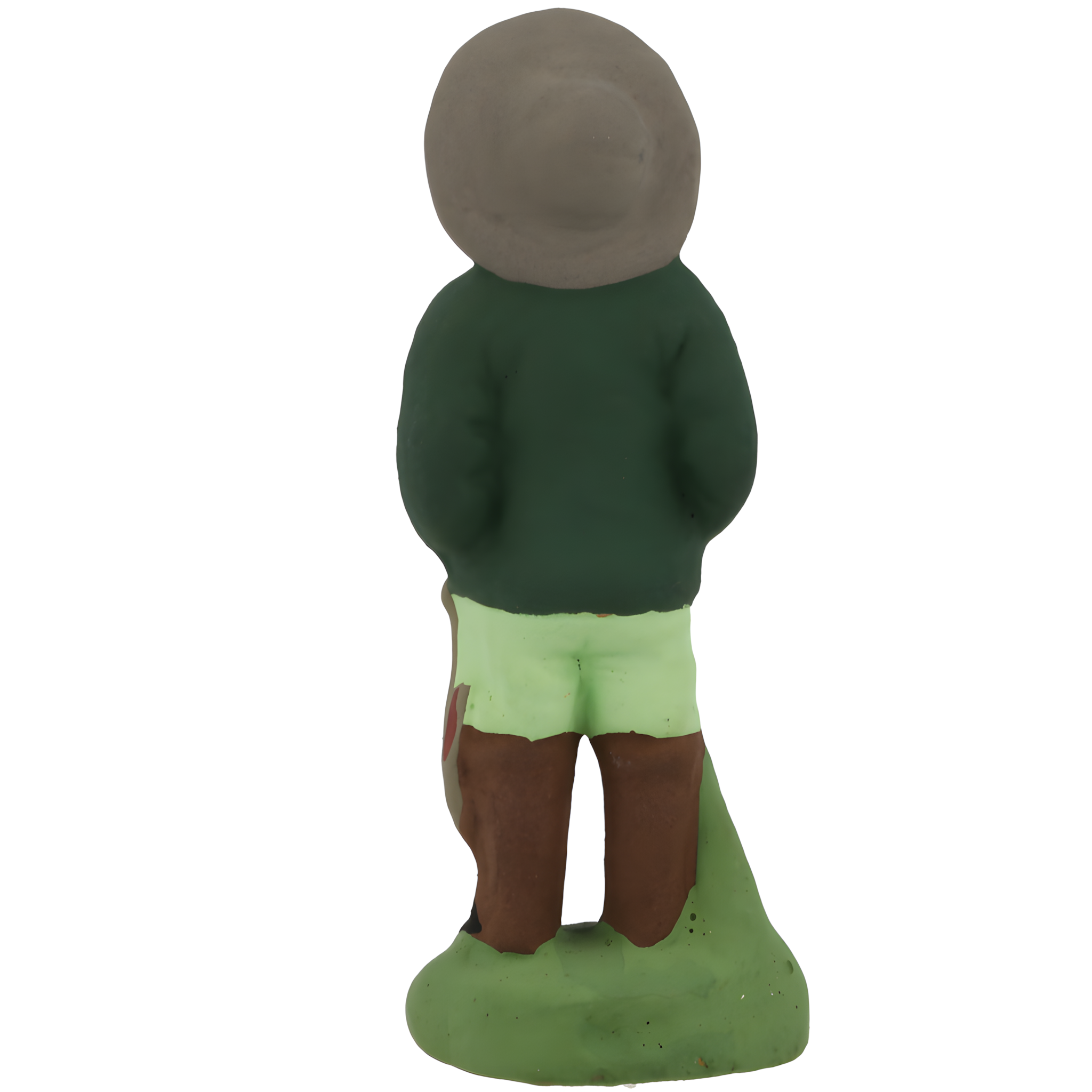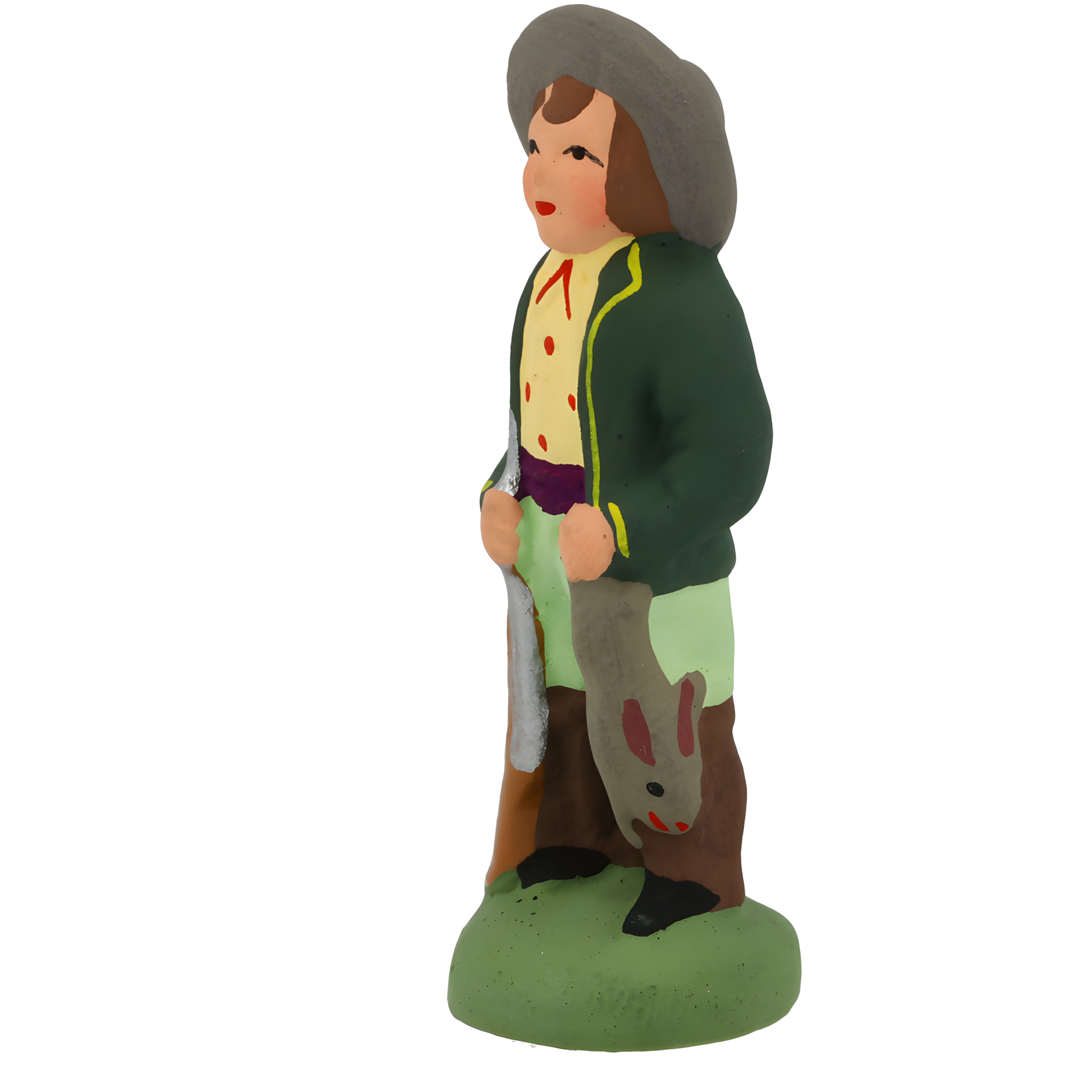Homme qui pratique la chasse. De tout temps, les garrigues provençales ont constitué d'excellents terrains de chasse. Le chasseur est une figure pittoresque: il raconte beaucoup d'histoires et se vante souvent d'exploits... qu'il n'a pas vraiment accomplis! Sa gibecière en bandoulière, il tient son fusil dans une main et un lapin dans l'autre. Il est coiffé d'un chapeau noir à large bord et chaussé de grandes bottes.