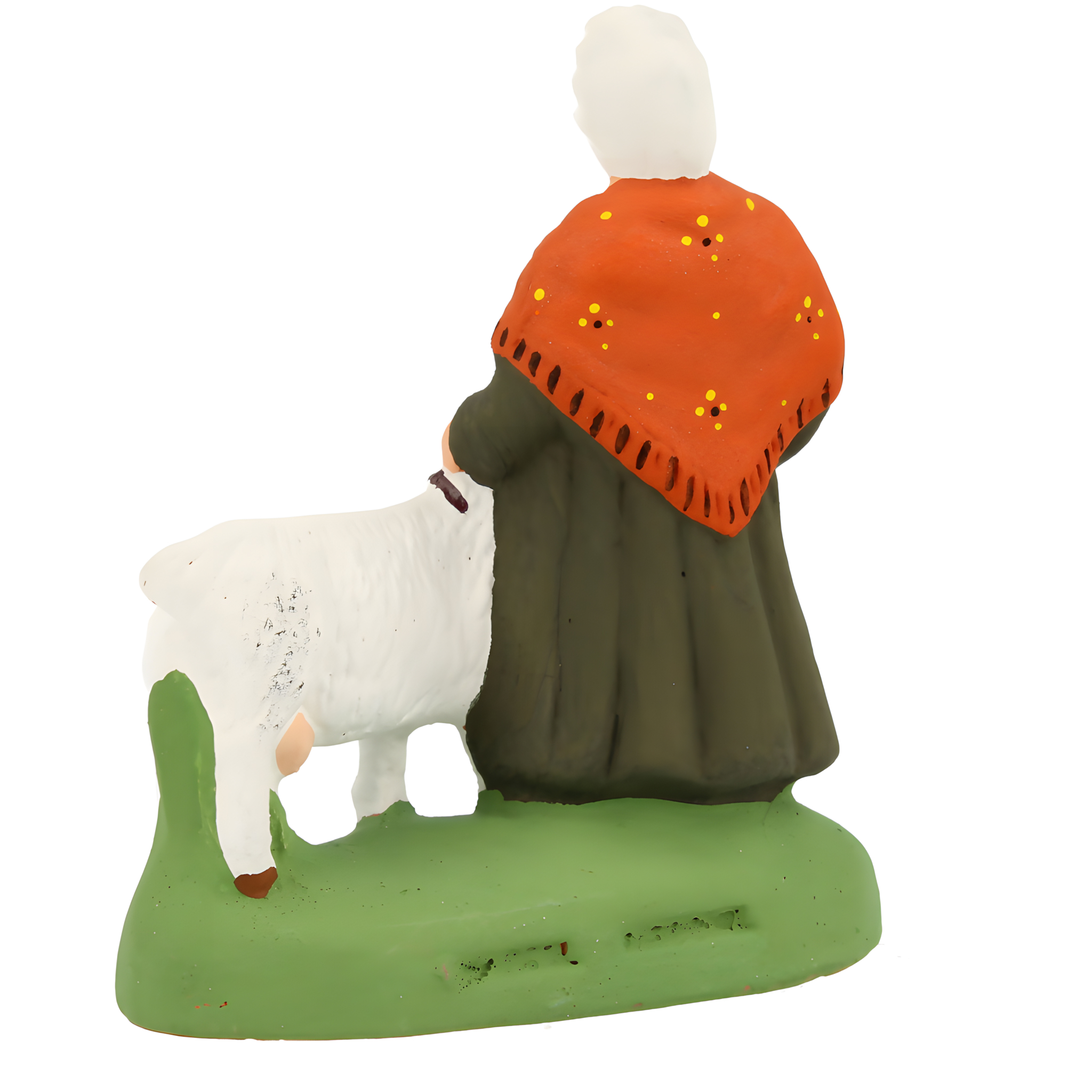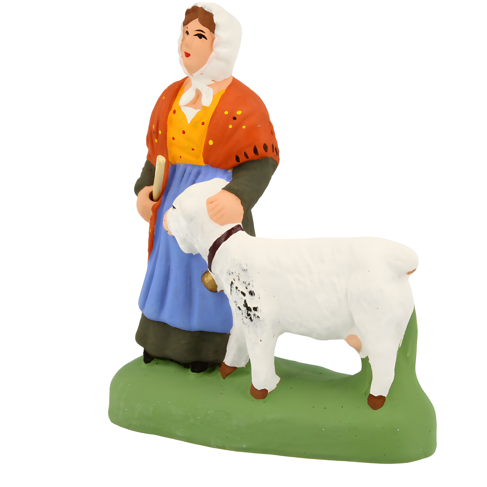 Paysanne accompagnée d'une chèvre. Sa coiffe blanche nouée sous le menton, elle a posé sur ses épaules un grand châle en laine. Elle doit être placée prés du troupeau de chèvres, animaux qui tiennent une place importante dans la vie provençale.