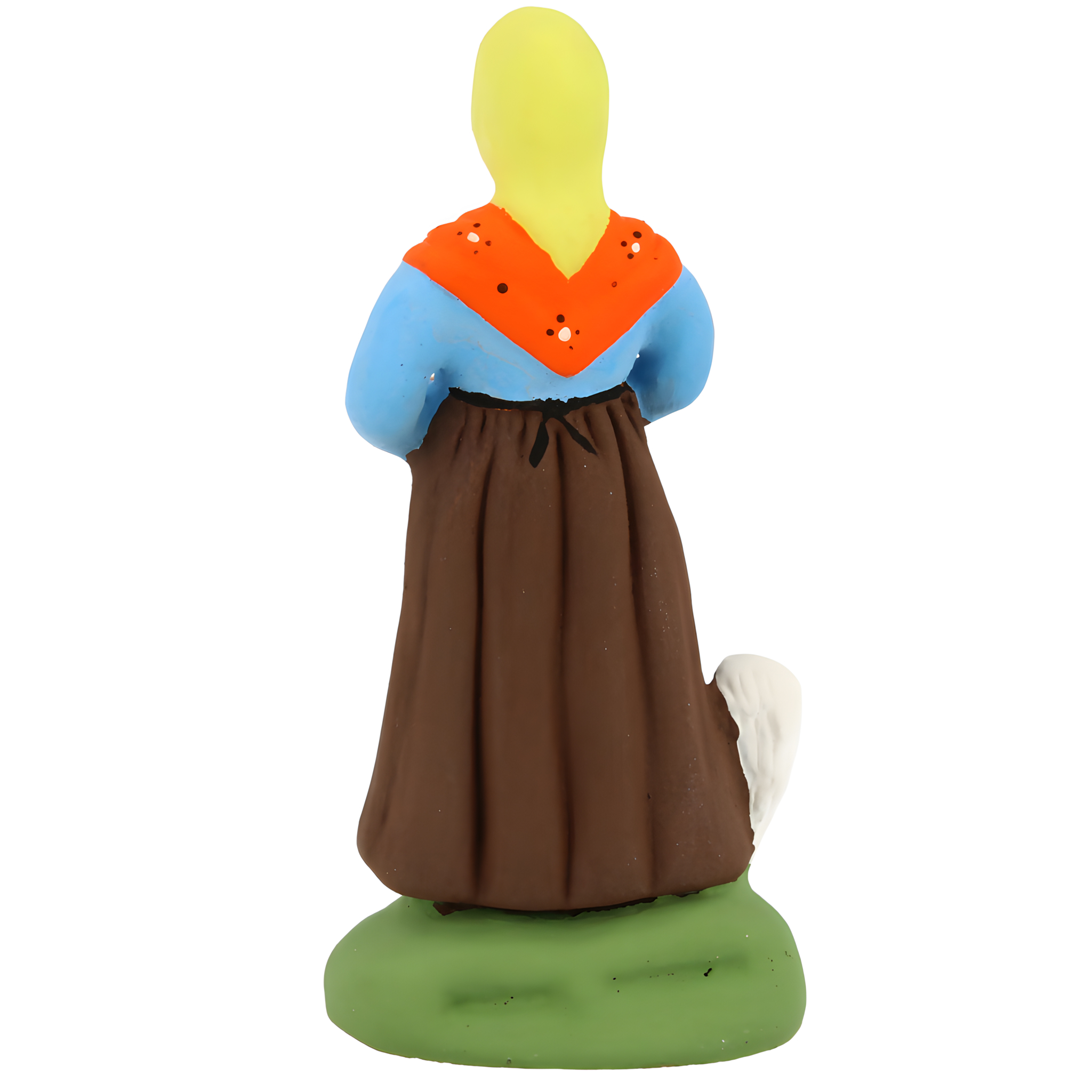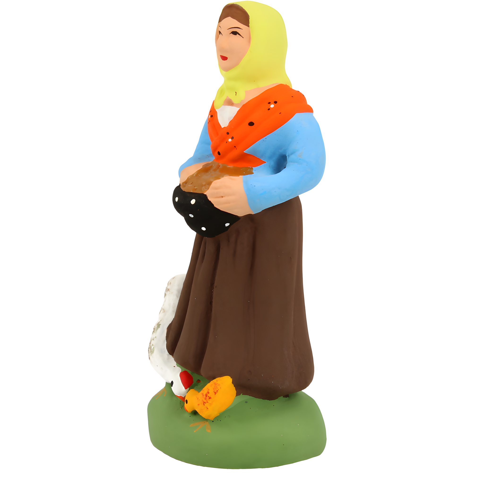 Paysanne dont le tablier relevé est rempli de graines qu'elle jette aux poules qui l'entourent. Dans la crèche, ce santon est placé dans la cour du mas, bâtiment typiquement provençal.