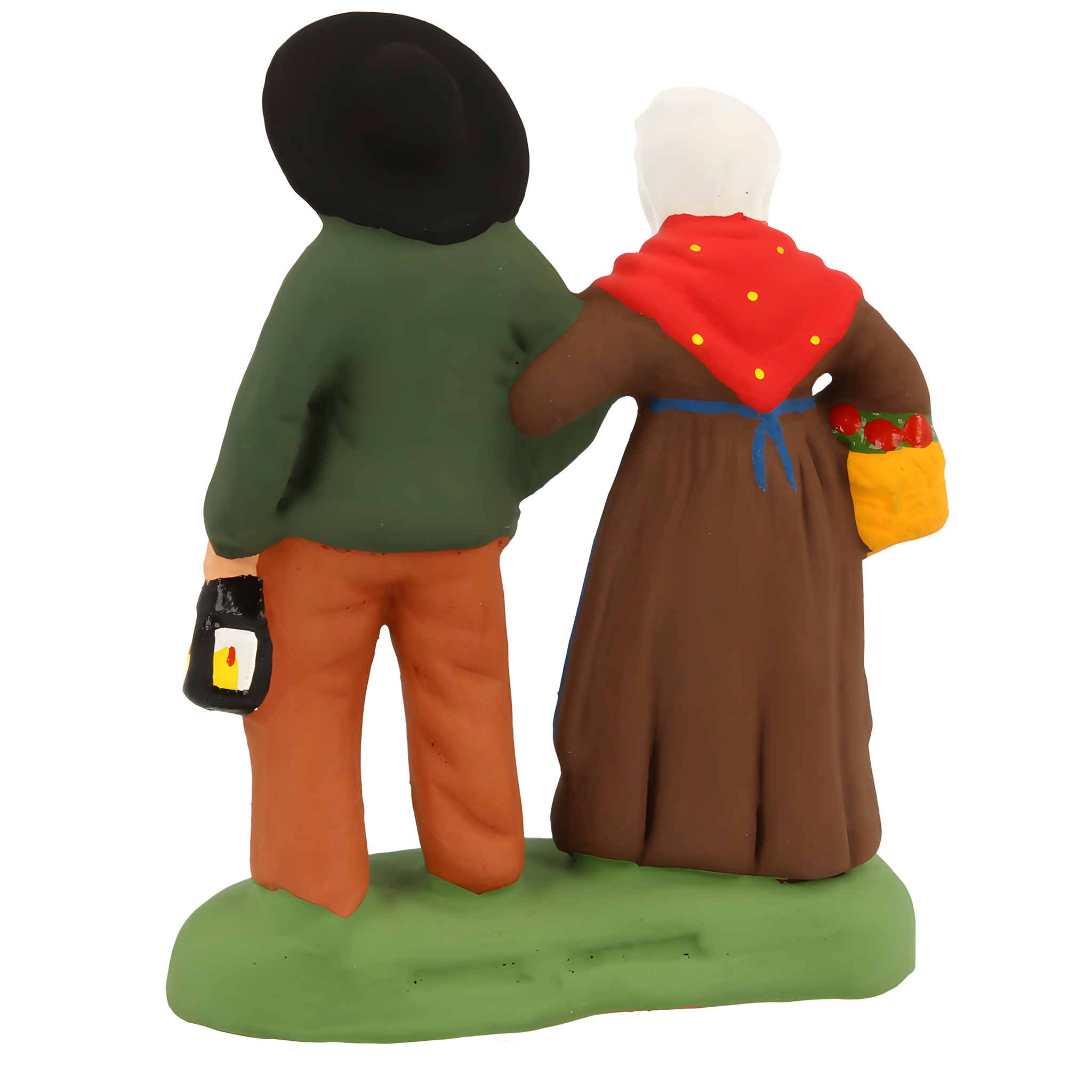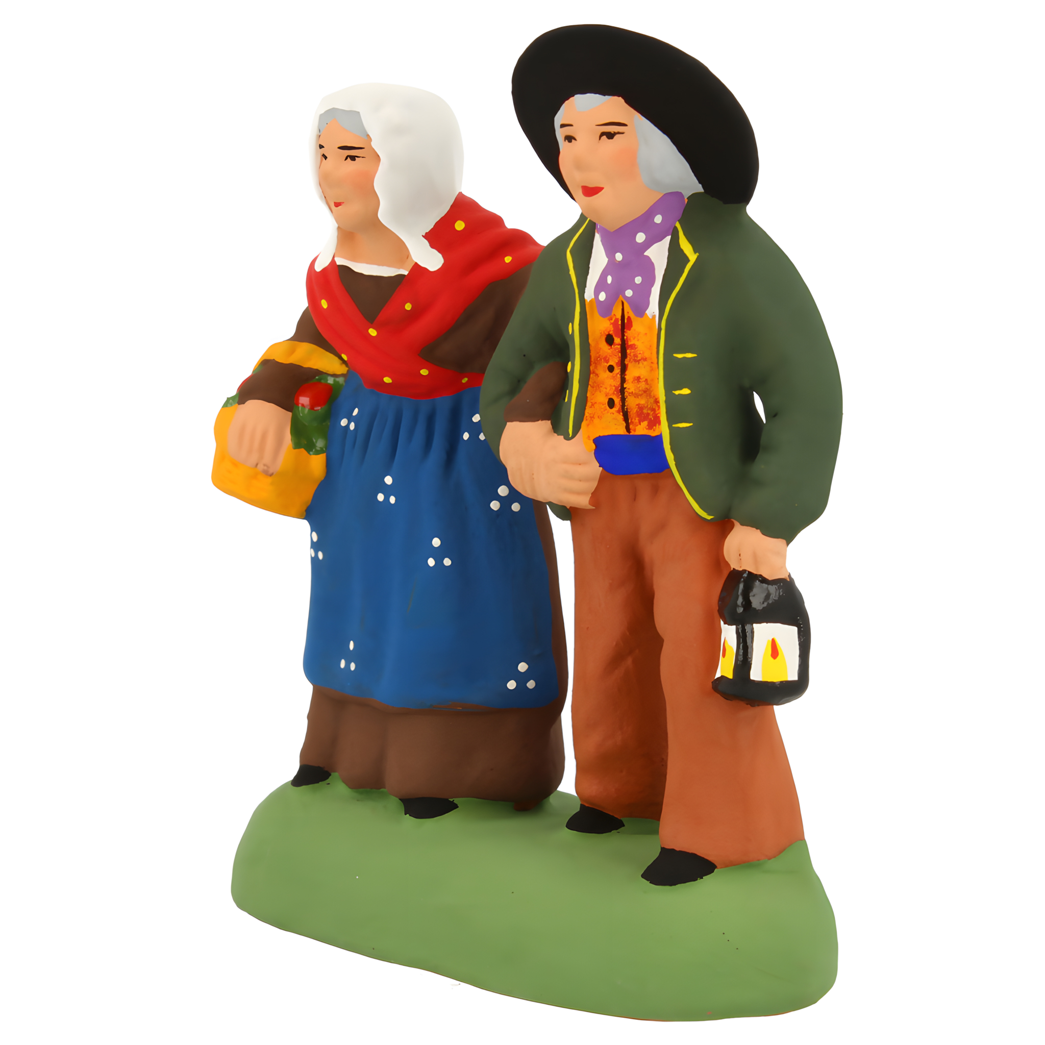 Couple de paysans âgés, se tenant par le bras. On les appelle Grasset et Grasseto. La femme, légèrement courbée, porte à son bras un panier rempli de fruits. Sa tenue est soignée : un petit fichu rouge posé sur ses épaules, un tablier bleu noué autour de la taille et une coiffe en coton blanc dont les pans retombent sur le cou. L'homme, en costume de fête, tient une lanterne pour guider leurs pas.