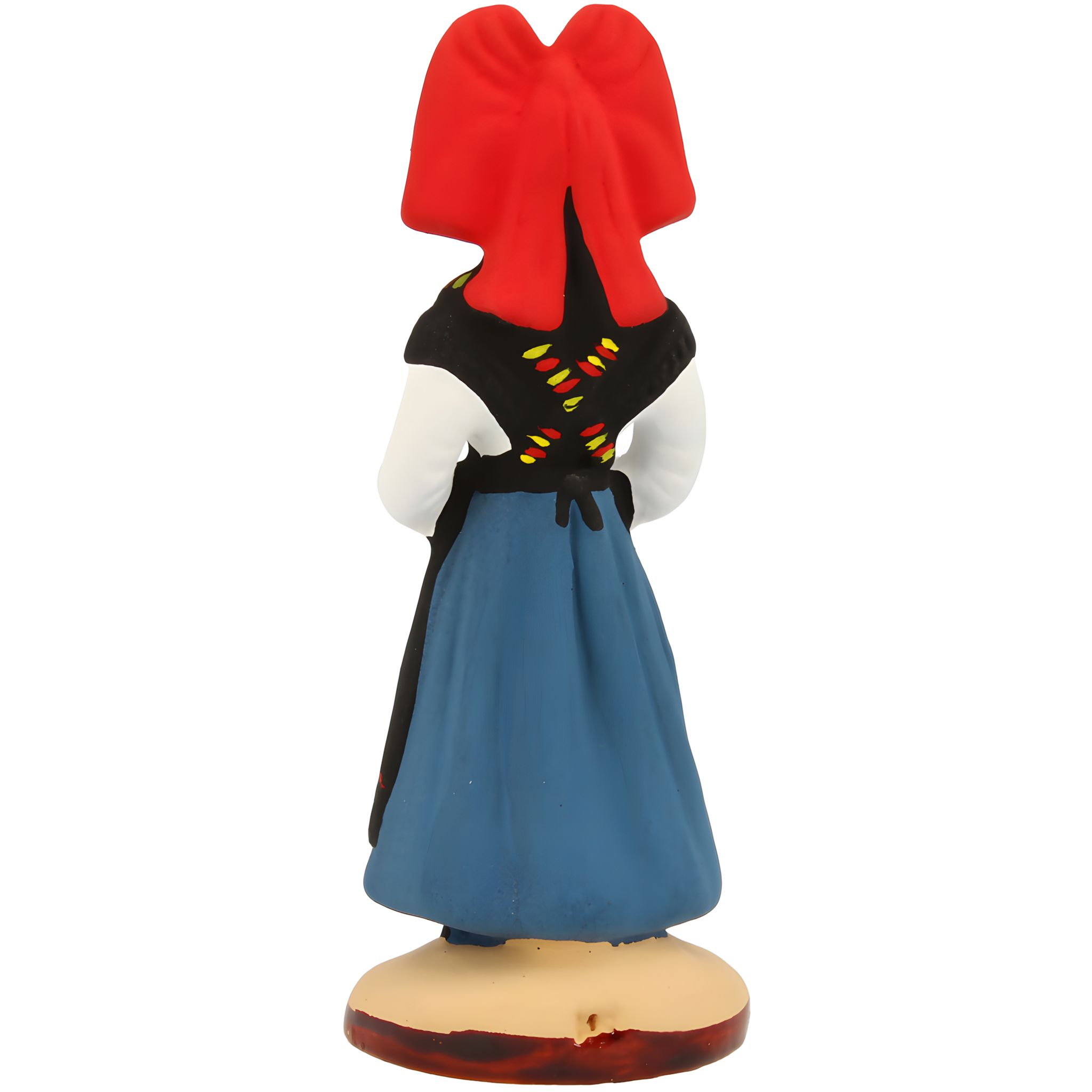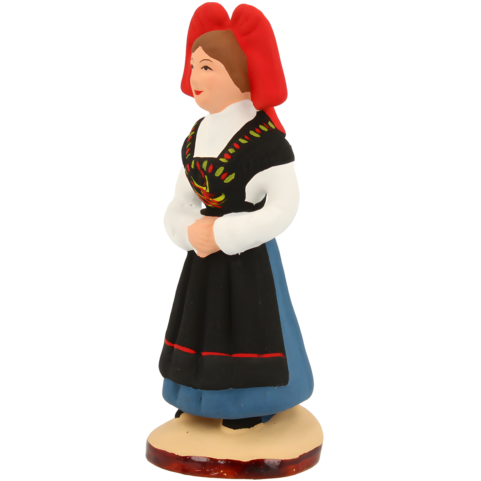 Ce santon de Provence représente une femme en costume traditionnel alsacien, vêtue d’une robe noire sobre et distinguée, d’un tablier assorti, d’un corsage blanc à manches longues, et coiffée du célèbre nœud noir alsacien.