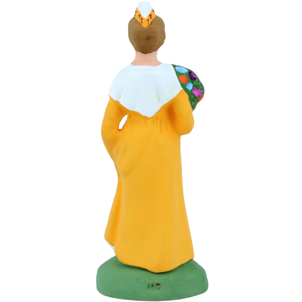 Egalement appelée “Arlatenco” en pays d’Arles. Jeune femme issue de la paysannerie aisée d’Arles. Elle tient à la main un bouquet de fleurs qu’elle s’apprête à offrir à l’enfant Jésus. Elle est parfois assimilée au personnage de Mireille, l’héroïne de l’écrivain Frédéric Mistral. Elle porte le costume traditionnel de la région d’Arles au xixe siècle, châle blanc brodé et large jupon. On la reconnaît également à sa coiffure particulière : les cheveux sont séparés par une raie médiane, formant un bandeau. Puis, la chevelure est ramenée en arrière en chignon recouvert d’une mousseline blanche et entouré d’un ruban brodé fixé par des épingles en or. C’est cet élément qui fait la richesse du costume. Arles est une ville d’art très ancienne et un centre important des traditions de la Provence. (existe avec robe bleue, violette, rouge ou jaune)