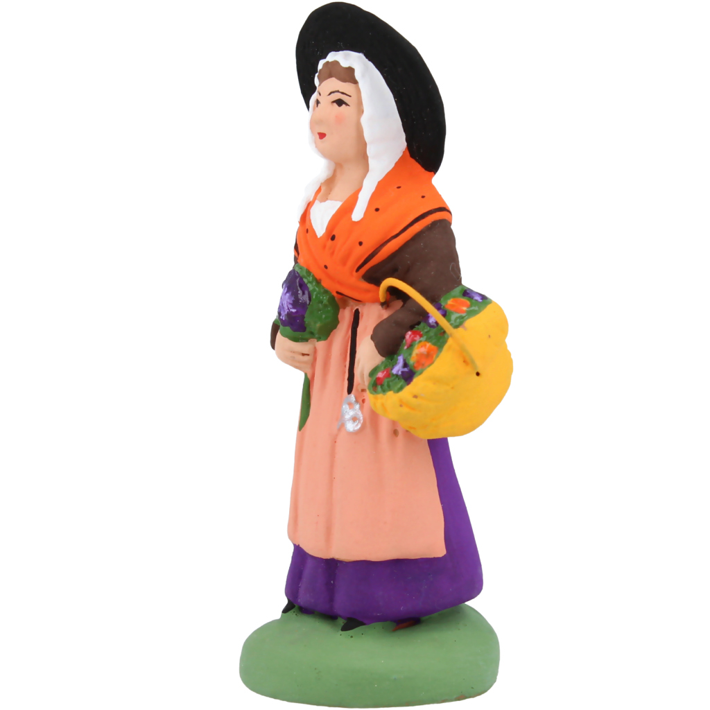 Marchande de fleurs ambulante. Ainsi que chacun des personnages de la crèche, elle apporte en offrande à l’enfant Jésus le fruit de son travail : un petit bouquet rond dans une main, un panier plein de fleurs à son bras. Une paire de ciseaux est rattachée à sa taille par un ruban noir. Sur sa coiffe en coton blanc, elle porte un chapeau noir à large bord pour mieux se protéger du soleil.