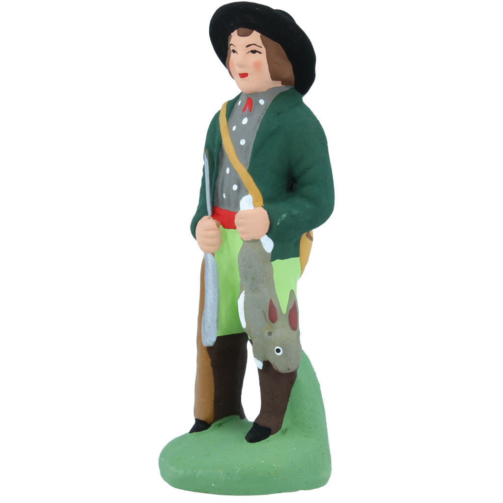 Homme qui pratique la chasse. De tout temps, les garrigues provençales ont constitué d'excellents terrains de chasse. Le chasseur est une figure pittoresque: il raconte beaucoup d'histoires et se vante souvent d'exploits... qu'il n'a pas vraiment accomplis! Sa gibecière en bandoulière, il tient son fusil dans une main et un lapin dans l'autre. Il est coiffé d'un chapeau noir à large bord et chaussé de grandes bottes.