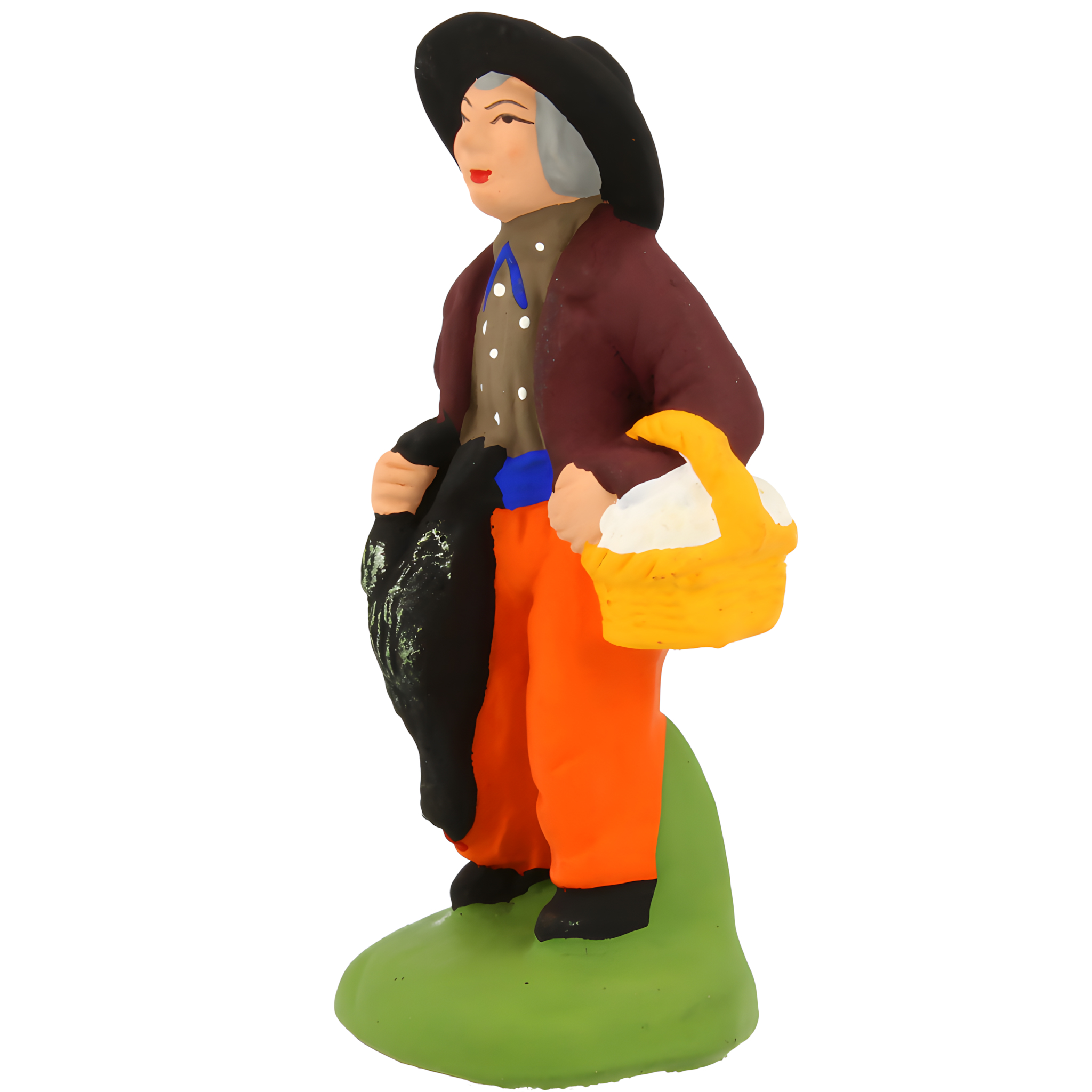Paysan, dont l'air jovial témoigne de sa fierté d'apporter en offrande à l'Enfant Jèsus une belle dinde et un panier rempli d'œufs frais. Comme l'oie, la dinde est réservée aux repas de fête et notamment celui de Noël.