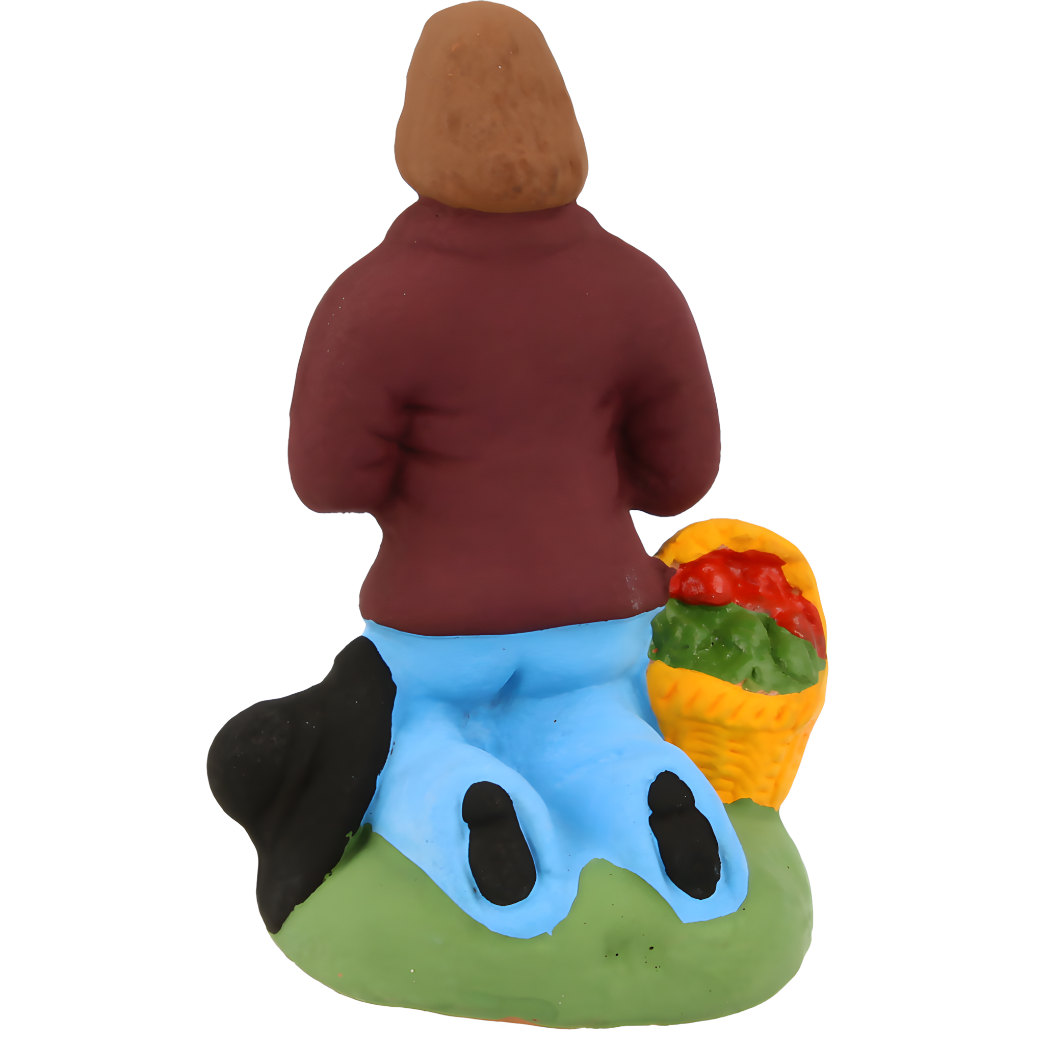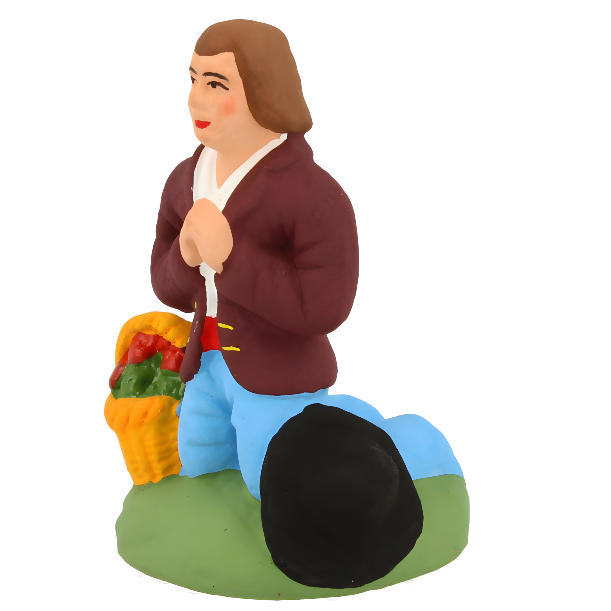 Couple de paysans à genoux. La prieuse est agenouillée apportant la pompe (la "poumpo"), gâteau provençal qui accompagne les desserts de Noël. La pompe est une galette plate et ronde, piercée d'ouvertures irrégulières. Elle est faite avec de la farine, de l'huile d'olive, du sucre et parfumée à l'eau de fleur d'oranger et au citron. Elle se déguste trempée dans du vin cuit. Le prieur a, posé à côté de lui, un panier qui contient les fruits qu'il a récoltés et qu'il vient offrir l'Enfant Jésus. Il a enlevé son chapeau noir à large bord. La prieuse et le prieur sont les premiers à offrir leurs présents.