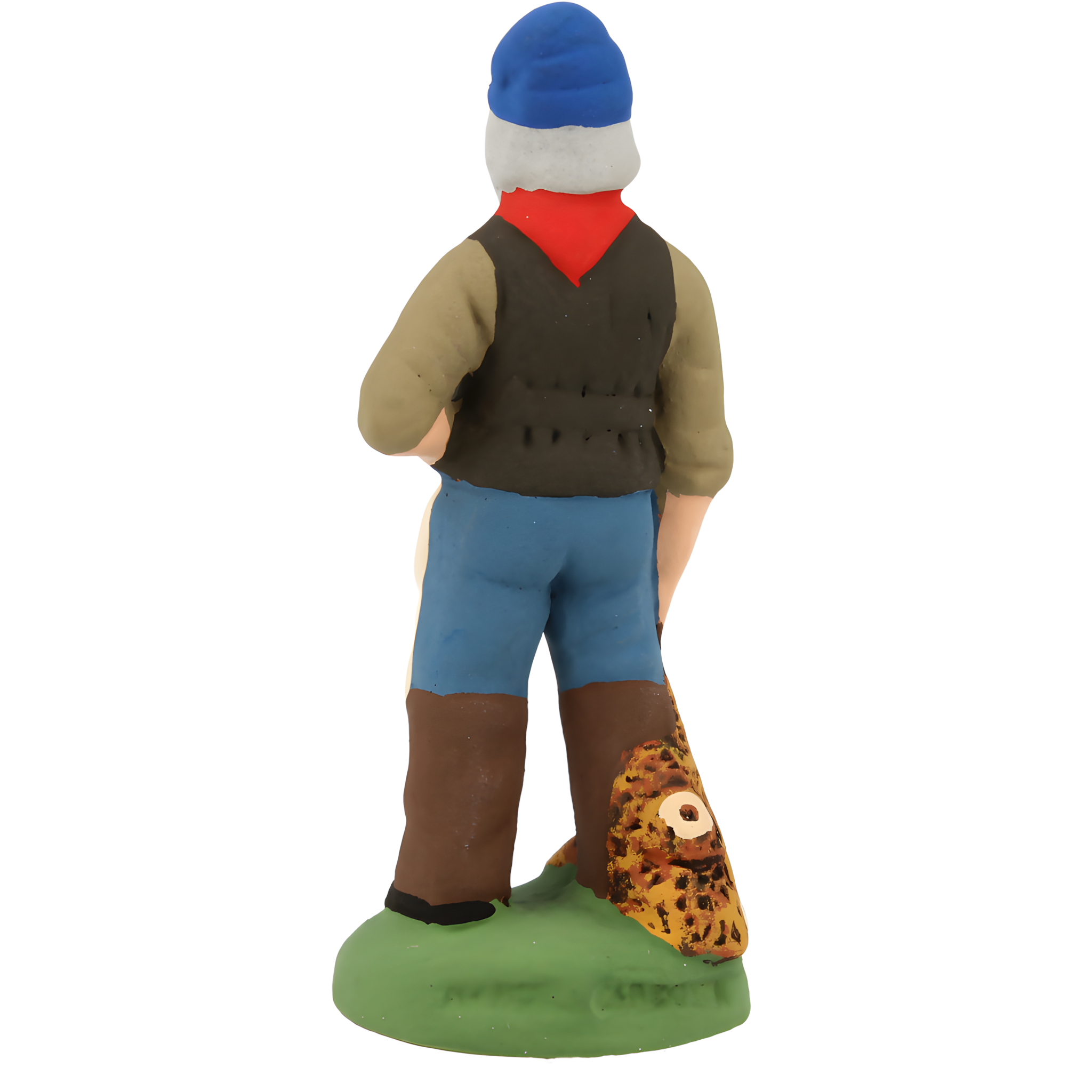 On appelle le pêcheur professionnel, “Lou pescadou”, et le pêcheur amateur, “Lou pescaire”. Homme qui vit de la pêche. Personnage important de la crèche : le poisson de mer ou d'eau douce constituant en effet une des bases de l'alimentation des Provençaux et faisant également l'objet de commerce extérieur à la région. Marcel Carbonel représente deux types de pêcheurs : en eau douce (le “pêcheur à la ligne” et le “pêcheur assis”) et en mer (le “pêcheur au filet”). Le pêcheur à la ligne (lou pescaire) est debout et tient dans sa main un beau poisson qu'il est fier de montrer. II porte sur ses sabots des guêtres en laine. Le pêcheur au filet (lou pescadou) a jeté un filet (le chalut) sur son épaule et porte sous son bras un panier rempli de poissons. Il a remonté les manches de son pull marin, relevé son pantalon jusqu'aux genoux et marche pieds nus. Tous les trois ont enroulé autour de leur taille, enserrant bien les reins, la “taïolo” (large et longue écharpe en laine, toujours rouge pour les pêcheurs) et sont coiffés d'un bonnet en coton rouge. Le pêcheur assis, que l'on dispose généralement près du petit pont au bord du torrent, a retroussé son pantalon jusqu'aux genoux. En pleine action, il tient une gaule dans une main et un poisson dans l'autre, sa “banaste” (panier d'osier) posée à côté de lui, pour y mettre les poissons pêchés.