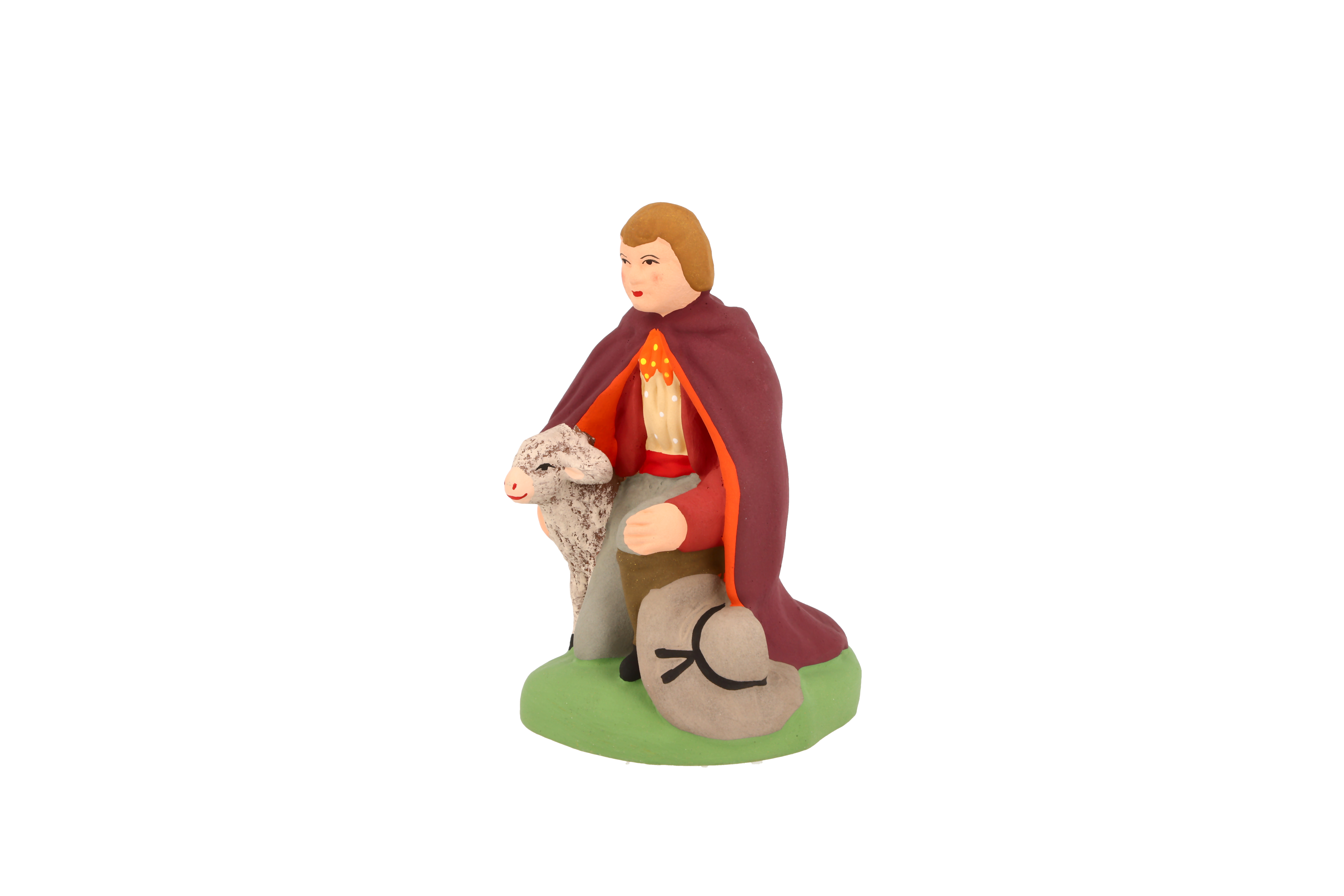 Homme qui garde et soigne les moutons. C’est le personnage qui a été averti en premier de la naissance de l’enfant Jésus par l’Ange du Seigneur. Présent dès les premières crèches santonnières, le berger occupe une place prépondérante dans la vie provençale ancienne. Accompagnés de leurs chiens pour conduire et surveiller les troupeaux, les bergers quittaient la vallée fin mai pour atteindre les pâturages en altitude. Marcel Carbonel les représente dans des attitudes différentes. Le berger appuyé est un homme jeune. Il porte une gourde et une musette contenant son repas. Dans ses mains, il tient un long bâton. Il est vêtu d’une culotte en gros drap, des guêtres en peau recouvrant ses souliers, une longue cape de bure (limousine) sur les épaules et coiffé d’un chapeau de feutre noir à large bord. L’homme au mouton, berger qui porte un agneau sur ses épaules. Le berger vieux, à la barbe blanche, est appuyé sur un long bâton. Il porte aussi la longue cape de bure sur un pantalon rapiécé et un chapeau noir. La bergère, vêtue de brun, sa cape recouvrant sa tête et ses épaules. Elle apporte un agneau à l’enfant Jésus et tient une badine à la main. Le berger à genoux est arrivé dans l’étable. Il porte une cape sur un gilet en peau de mouton. A côté de lui, un agneau qu’il apporte à l’enfant Jésus, son chapeau à la main. Le berger couché n’a pas encore entendu l’appel des anges. Il est allongé sous un petit arbre et dort profondément.