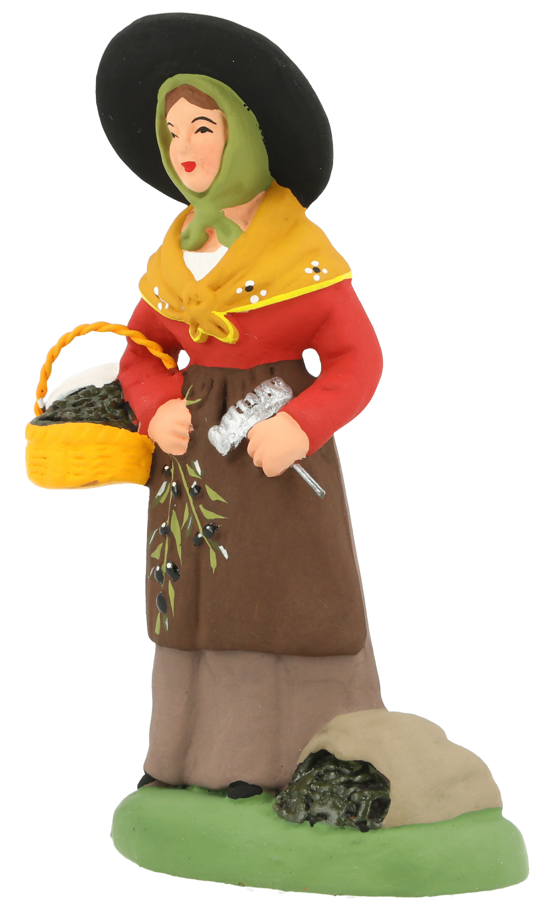 Équipée de son peigne (pènchi) et de son panier (panié óulivaire), notre vaillante et patiente provençale entame la saison de récolte des olives (óulivado). Si les olives vertes sont cueillies fin septembre-octobre, les olives noires sont quant à elles ramassées entre novembre et décembre.