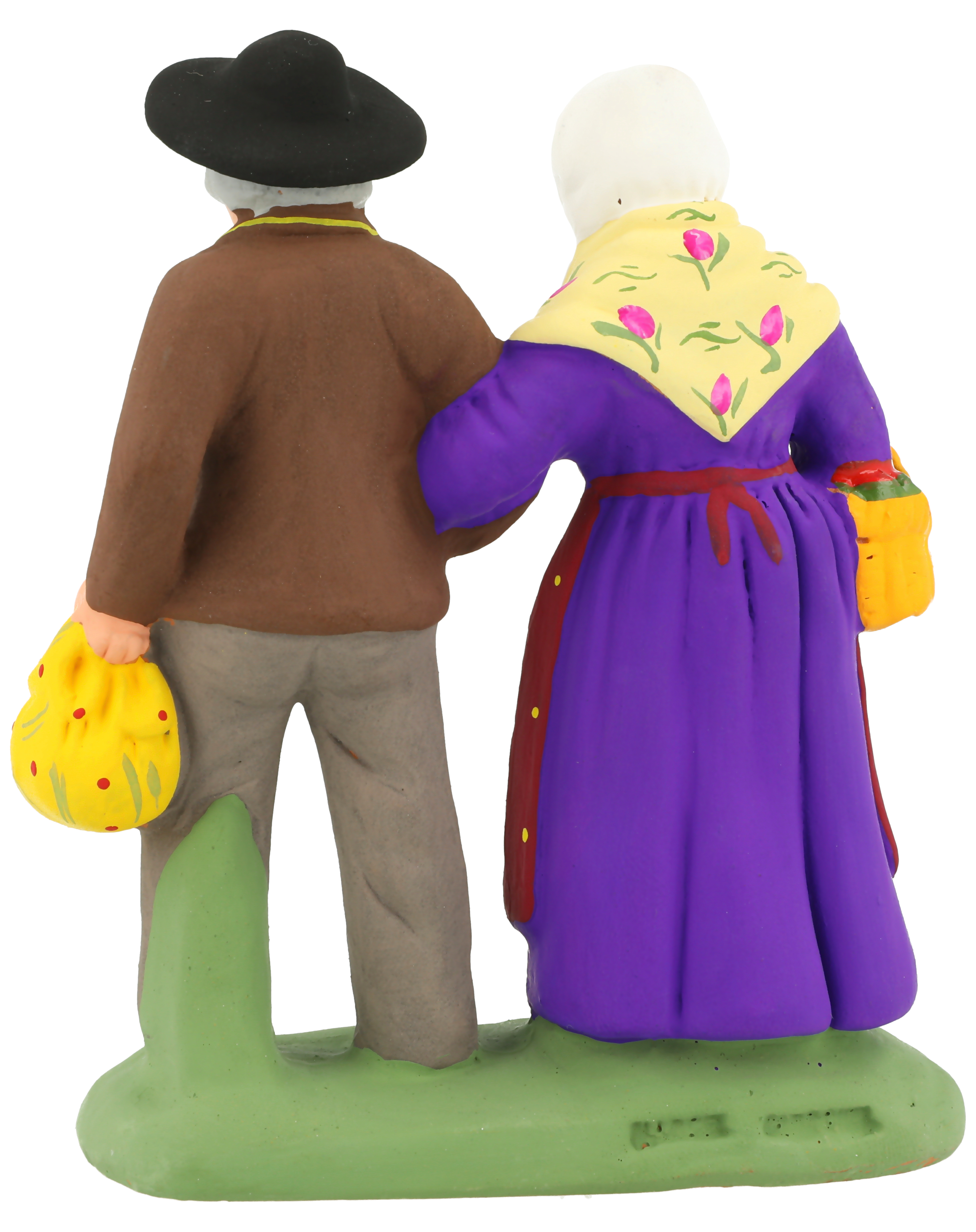 Couple de paysans âgés, se tenant par le bras. On les appelle Grasset et Grasseto. La femme, légèrement courbée, porte à son bras un panier rempli de fruits. Sa tenue est soignée : un petit fichu rouge posé sur ses épaules, un tablier bleu noué autour de la taille et une coiffe en coton blanc dont les pans retombent sur le cou. L'homme, en costume de fête, tient une lanterne pour guider leurs pas.