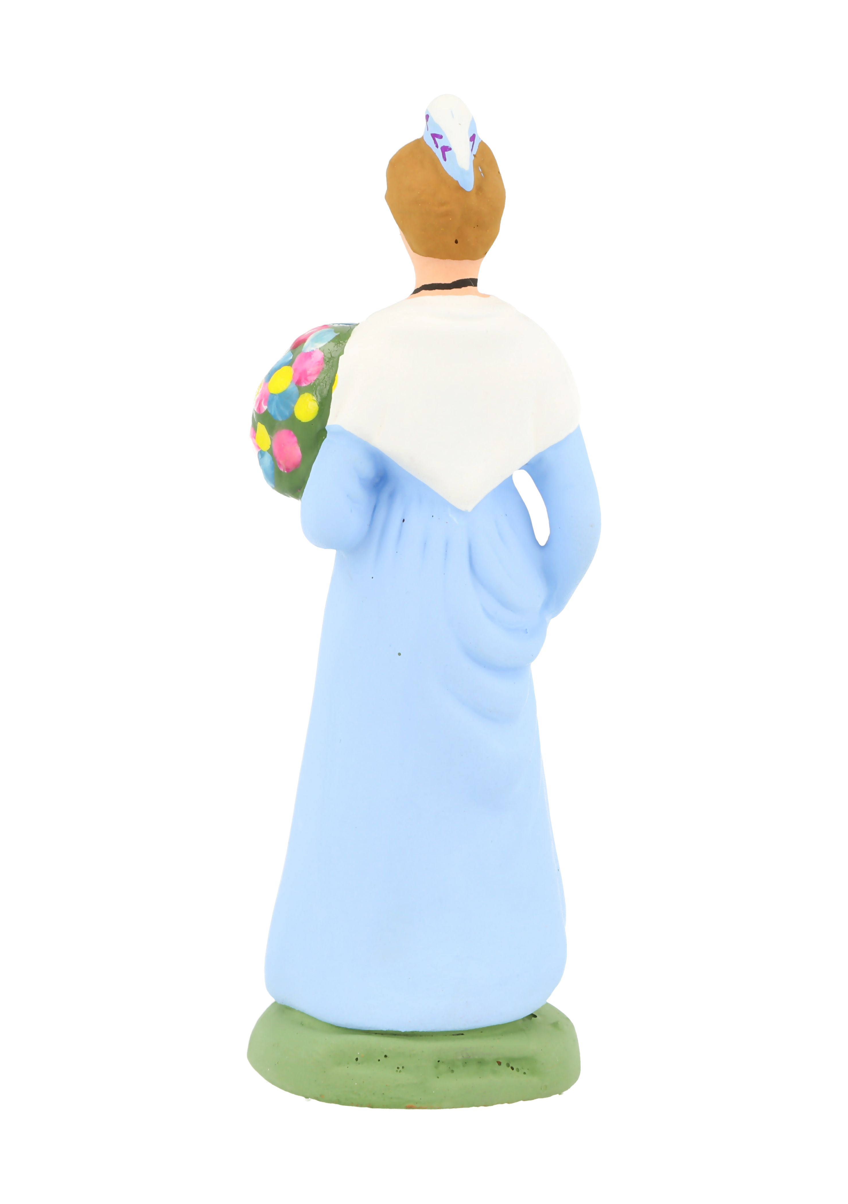 Egalement appelée “Arlatenco” en pays d’Arles. Jeune femme issue de la paysannerie aisée d’Arles. Elle tient à la main un bouquet de fleurs qu’elle s’apprête à offrir à l’enfant Jésus. Elle est parfois assimilée au personnage de Mireille, l’héroïne de l’écrivain Frédéric Mistral. Elle porte le costume traditionnel de la région d’Arles au xixe siècle, châle blanc brodé et large jupon. On la reconnaît également à sa coiffure particulière : les cheveux sont séparés par une raie médiane, formant un bandeau. Puis, la chevelure est ramenée en arrière en chignon recouvert d’une mousseline blanche et entouré d’un ruban brodé fixé par des épingles en or. C’est cet élément qui fait la richesse du costume. Arles est une ville d’art très ancienne et un centre important des traditions de la Provence. (existe avec robe bleue, violette, rouge ou jaune)
