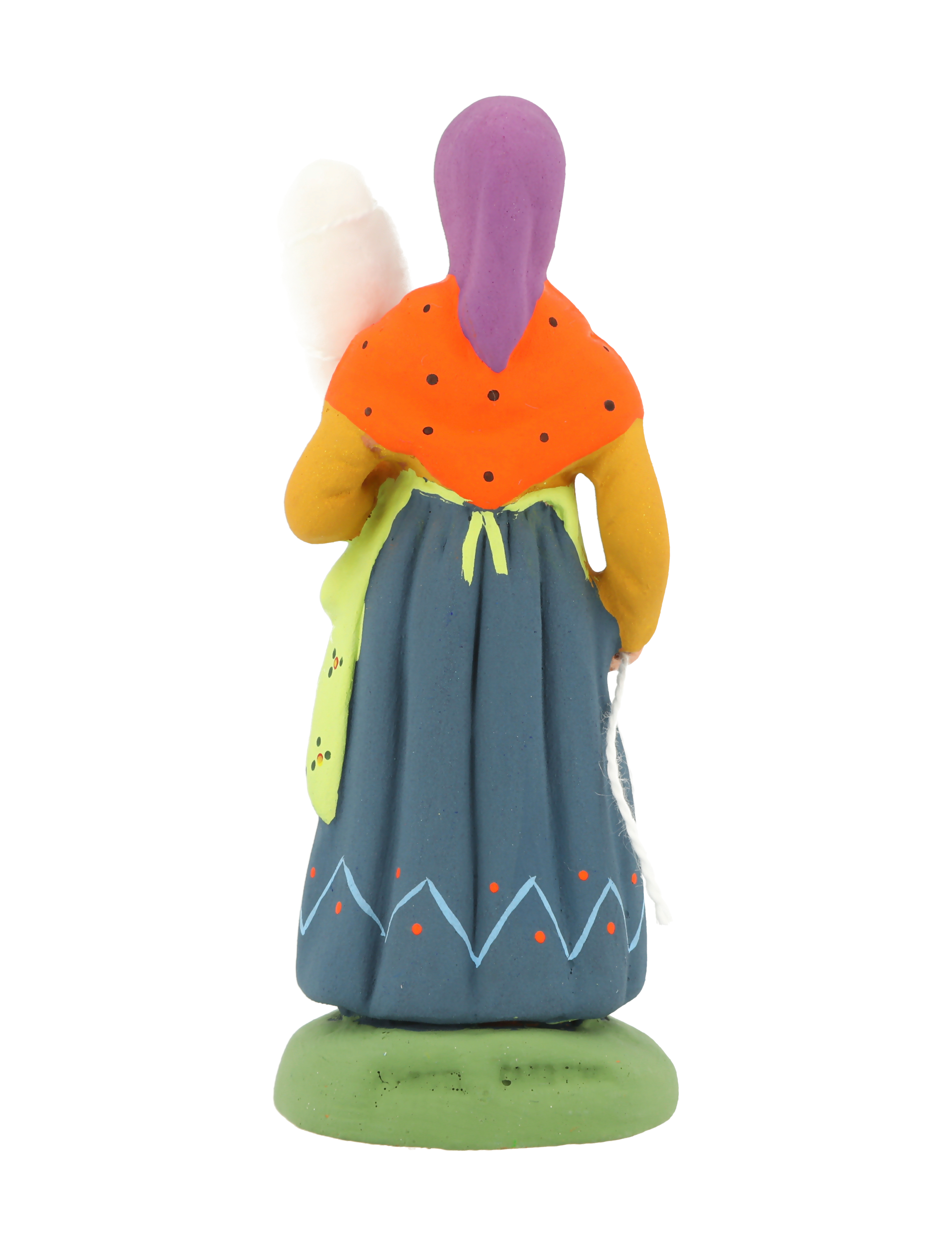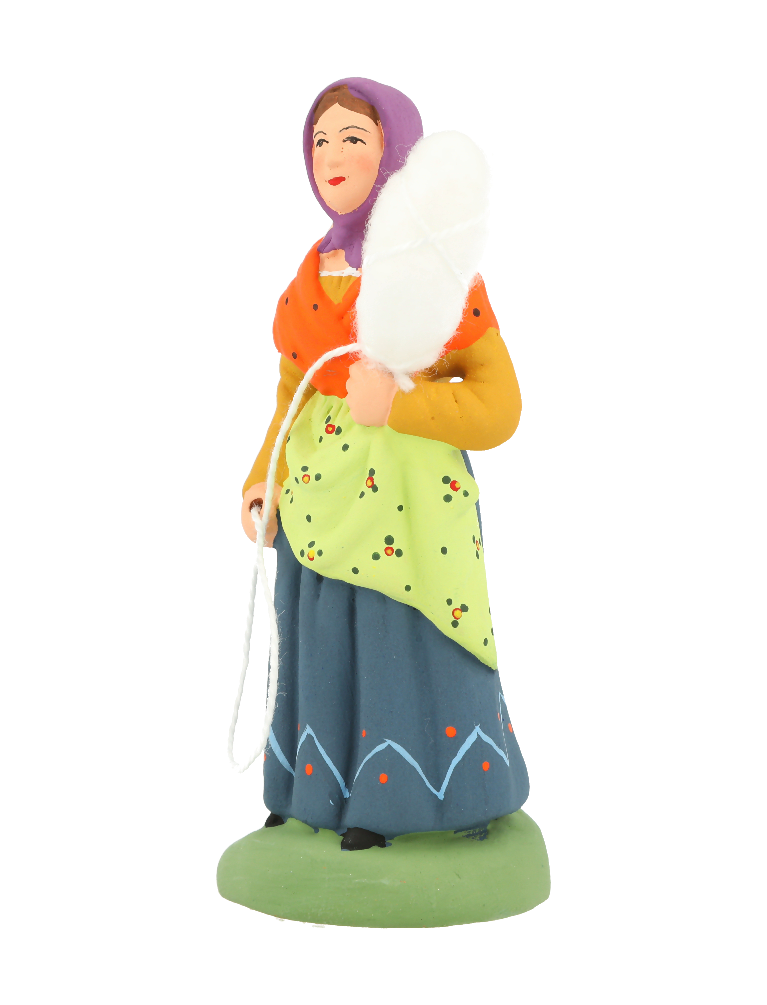Jeune femme debout tenant une quenouille de laine dans une main. Elle est souvent placée près des troupeaux de moutons. Elle est vêtue de brun, un fichu sur les épaules et un petit tablier autour de la taille. Le bas de son tablier est remonté pour former une poche dans laquelle la fileuse garde les lambeaux de toison de mouton qu'elle est en train de filer patiemment sur sa quenouille.
