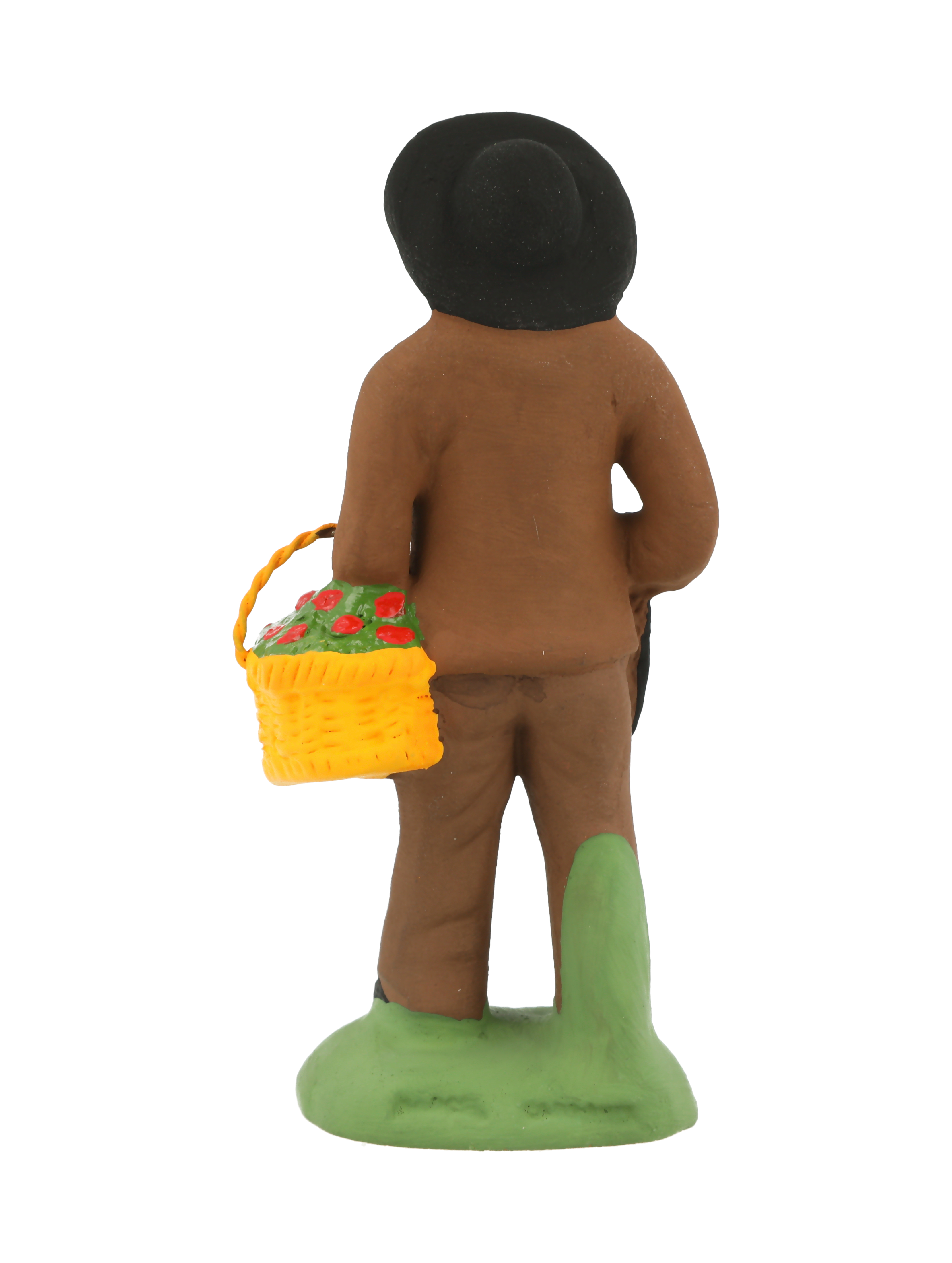 Paysan, dont l'air jovial témoigne de sa fierté d'apporter en offrande à l'Enfant Jèsus une belle dinde et un panier rempli d'œufs frais. Comme l'oie, la dinde est réservée aux repas de fête et notamment celui de Noël.