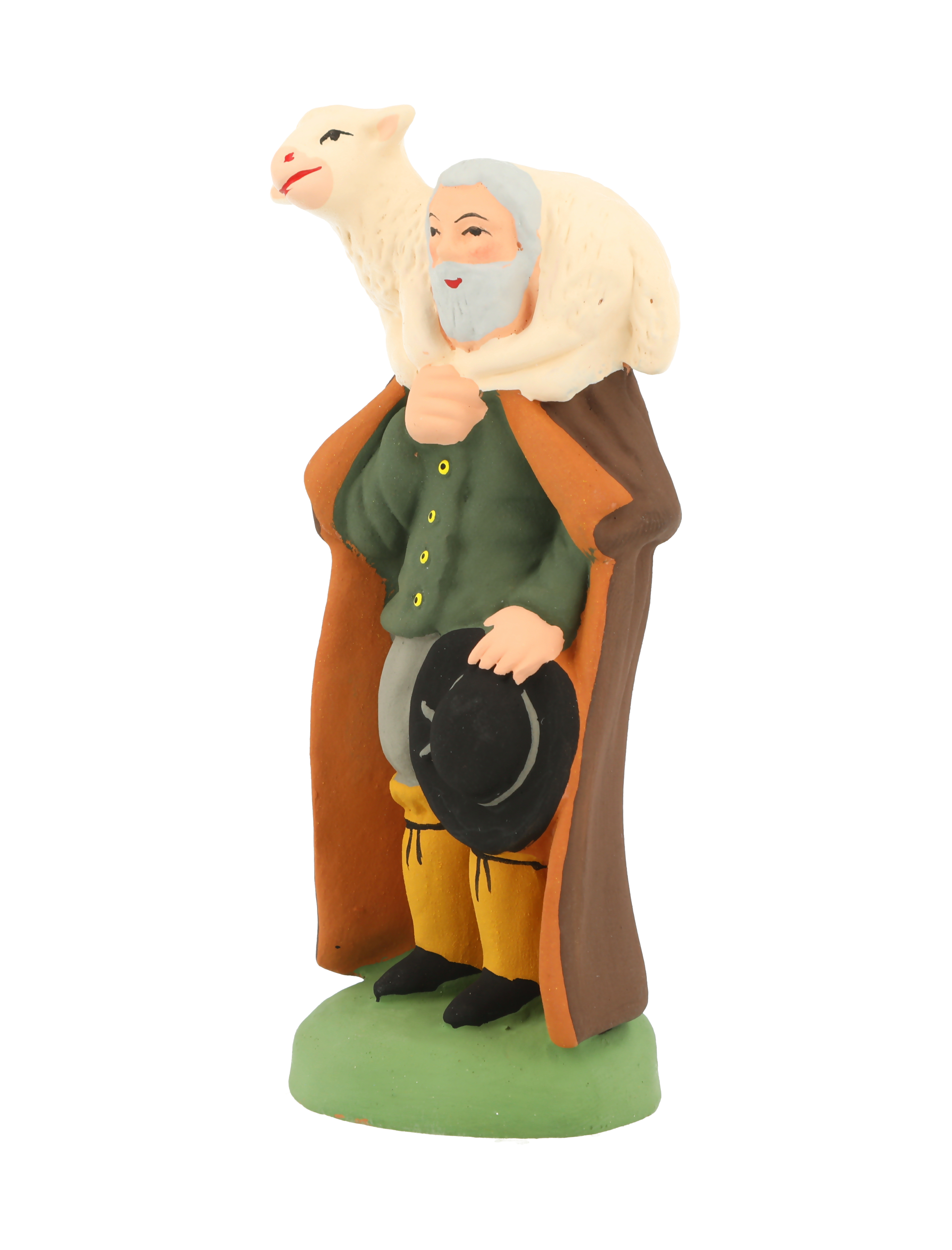 Homme qui garde et soigne les moutons. C’est le personnage qui a été averti en premier de la naissance de l’enfant Jésus par l’Ange du Seigneur. Présent dès les premières crèches santonnières, le berger occupe une place prépondérante dans la vie provençale ancienne. Accompagnés de leurs chiens pour conduire et surveiller les troupeaux, les bergers quittaient la vallée fin mai pour atteindre les pâturages en altitude. Marcel Carbonel les représente dans des attitudes différentes. Le berger appuyé est un homme jeune. Il porte une gourde et une musette contenant son repas. Dans ses mains, il tient un long bâton. Il est vêtu d’une culotte en gros drap, des guêtres en peau recouvrant ses souliers, une longue cape de bure (limousine) sur les épaules et coiffé d’un chapeau de feutre noir à large bord. L’homme au mouton, berger qui porte un agneau sur ses épaules. Le berger vieux, à la barbe blanche, est appuyé sur un long bâton. Il porte aussi la longue cape de bure sur un pantalon rapiécé et un chapeau noir. La bergère, vêtue de brun, sa cape recouvrant sa tête et ses épaules. Elle apporte un agneau à l’enfant Jésus et tient une badine à la main. Le berger à genoux est arrivé dans l’étable. Il porte une cape sur un gilet en peau de mouton. A côté de lui, un agneau qu’il apporte à l’enfant Jésus, son chapeau à la main. Le berger couché n’a pas encore entendu l’appel des anges. Il est allongé sous un petit arbre et dort profondément.